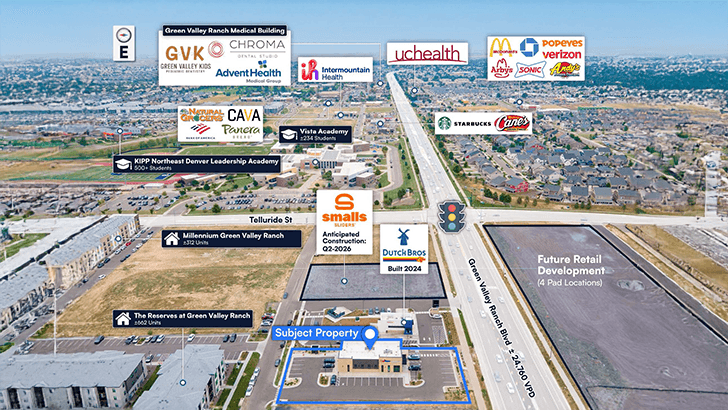 Booming Development | 1,000+ New Construction Units in 0.5 Mile Radius – The property is at the center of booming development in Denver, CO, surrounded by dozens of new construction retail and residential developments. The location sites directly in front of The Reserves at Green Valley Ranch (216 Units) and Millenium Green Valley Ranch (312 units) apartment complexes, both built within the last 3 years alone. There are over 1,000+ residential units built within only a 0.5 mile radius of the asset, with hundreds more planned for 2026. This provides immediate proximity to thousands of residents and built-in customer traffic- ideal for service-based businesses seeking a dense and growing customer base.