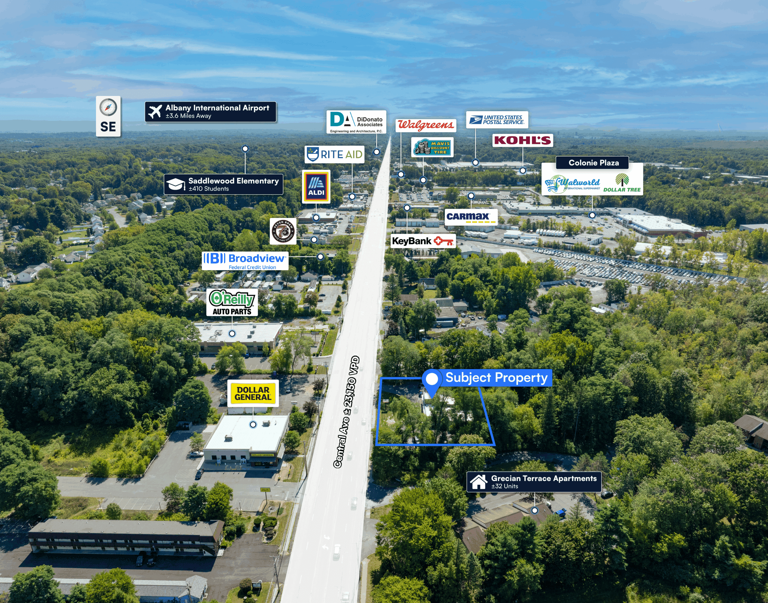 Concentrated Corridor – The property is surrounded by a mix of residential communities, schools, parks, hospitals, and major retailers, including Target, Lowe’s, Trader Joe’s, Walmart Supercenter, Shaker Ridge Country Club, Albany International Airport, and Crossgates Mall all just ±5 miles away.
