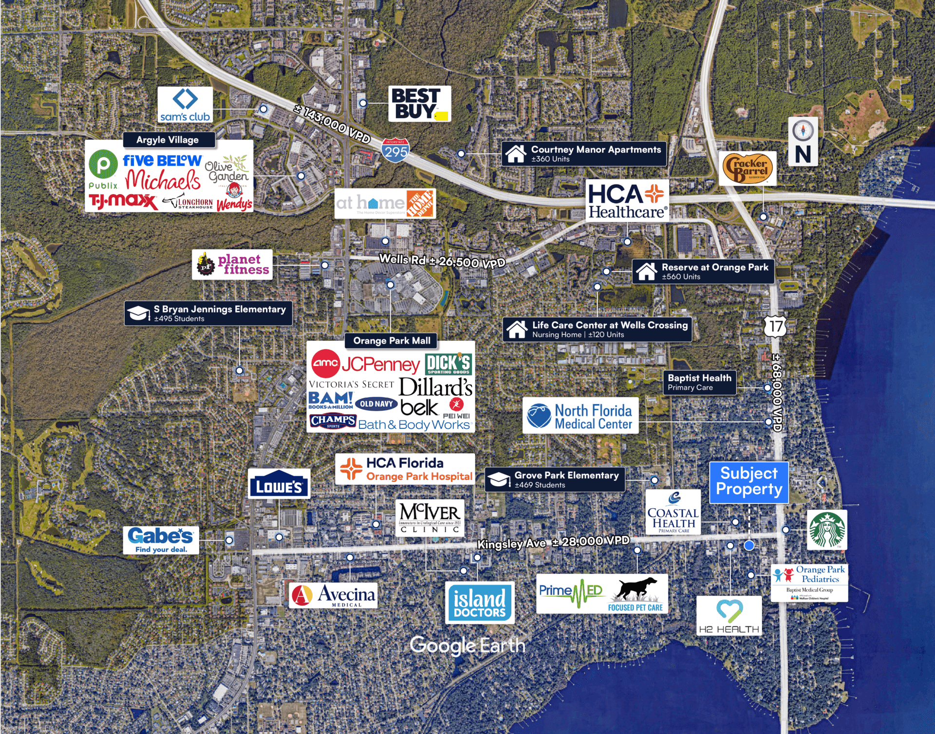 - High-Visibility Retail & Medical Corridor – The property benefits from high visibility on Kingsley Ave with 170+ feet of frontage and ±29,000 VPD, just 0.2 miles from the Park Ave intersection carrying ±70,000 VPD—one of Clay County’s primary commercial traffic corridors.