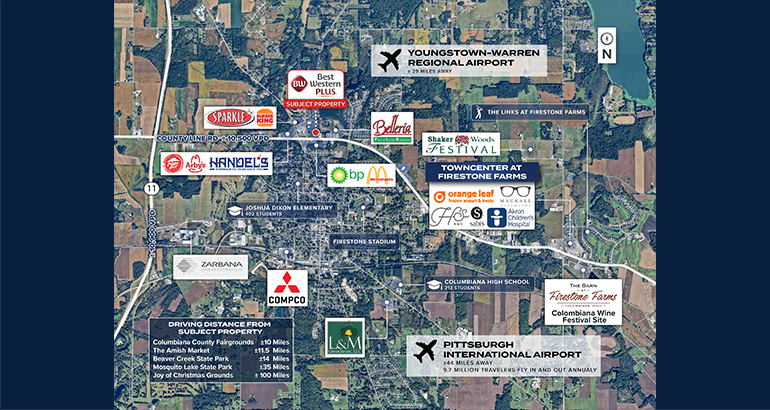 Stable underserved market – Columbiana offers a low-competition environment with limited branded hotel supply. The local economy is anchored by regional industry and benefits from a growing base of business tied to logistics, energy, and light manufacturing. The area’s accessibility to Cleveland, Akron, and Pittsburgh supports regional demand year-round.