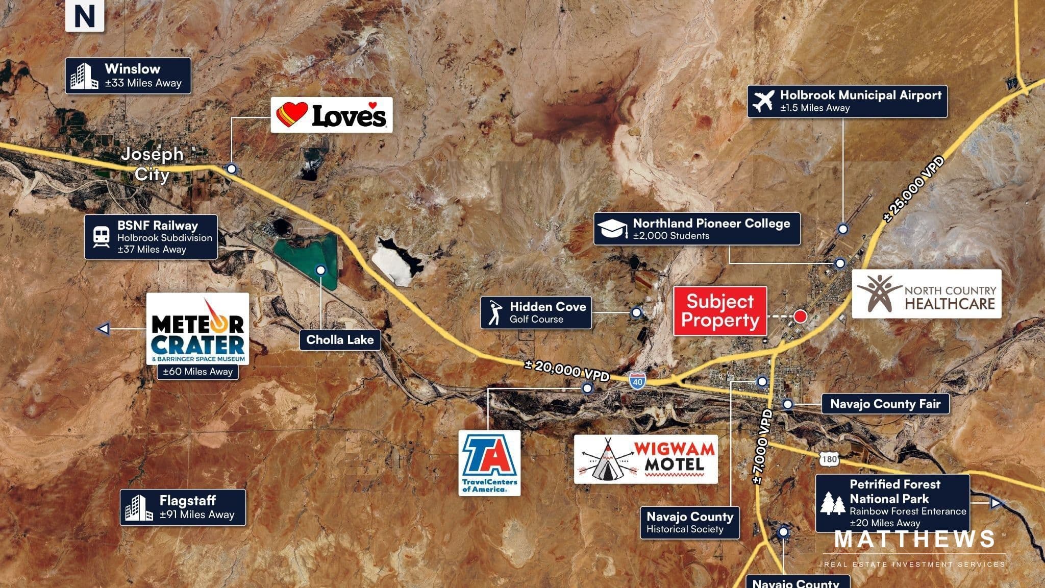 Proximity to Tourism Anchors: Major tourism anchors nearby, including Petrified Forest National Park (800k visitors), Painted Desert (800k), Meteor Crater (250k), and the Navajo Nation.