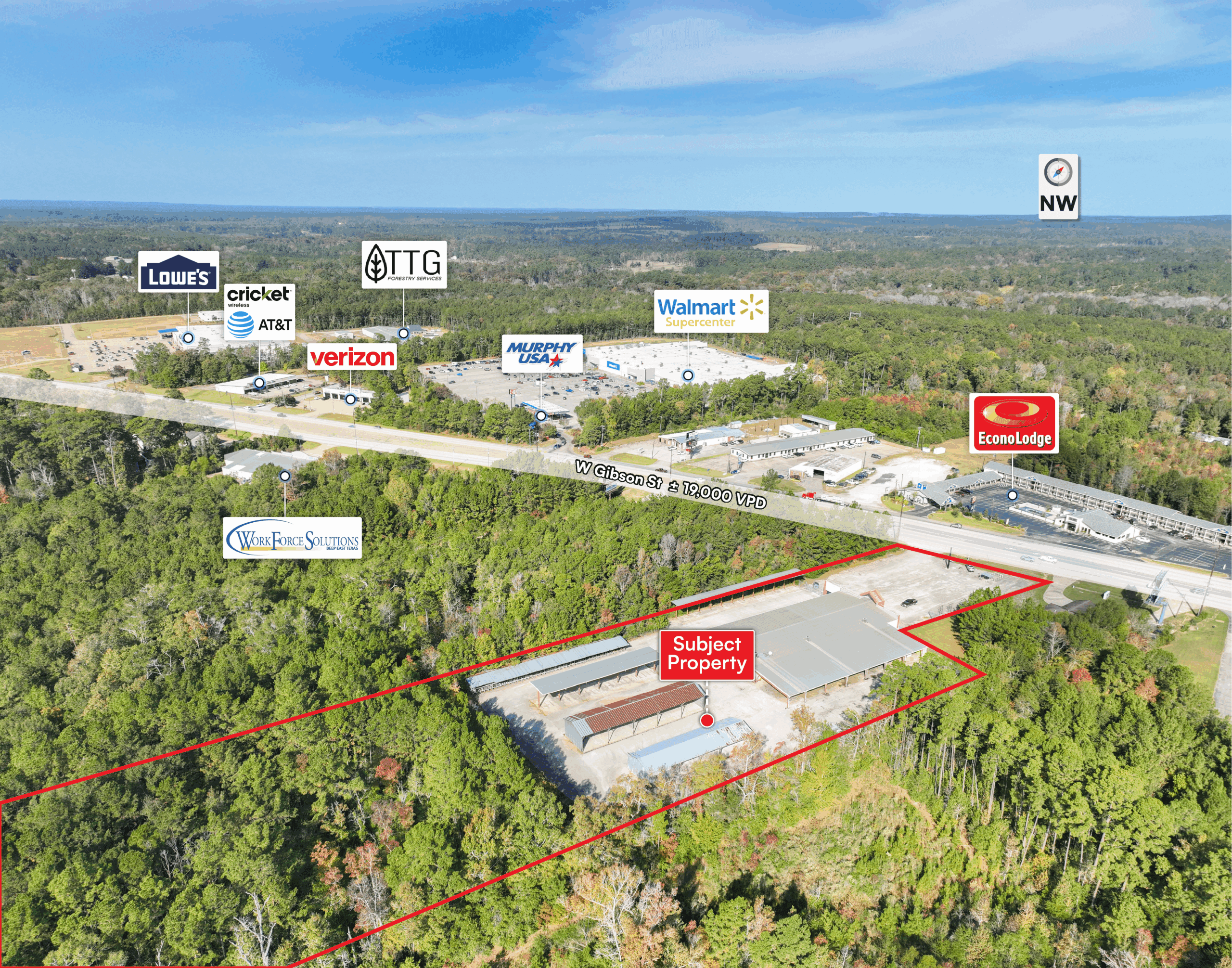 - Strategic East Texas Location / Income Tax-Free State: Located in downtown Jasper, directly across from the newly constructed Walmart Supercenter and Lowe’s Home Improvement, the property benefits from excellent visibility, strong traffic counts, and convenient access to major thoroughfares including US-96, US-190, and US-63. This central location serves the broader East Texas region and supports a wide range of commercial, retail, storage, and services uses.