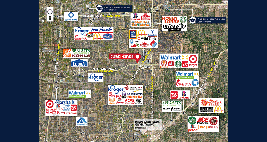 Direct access and visibility to the highly traveled N Tarrant Pkwy; left turning lane accessible with superior ingress/egress
