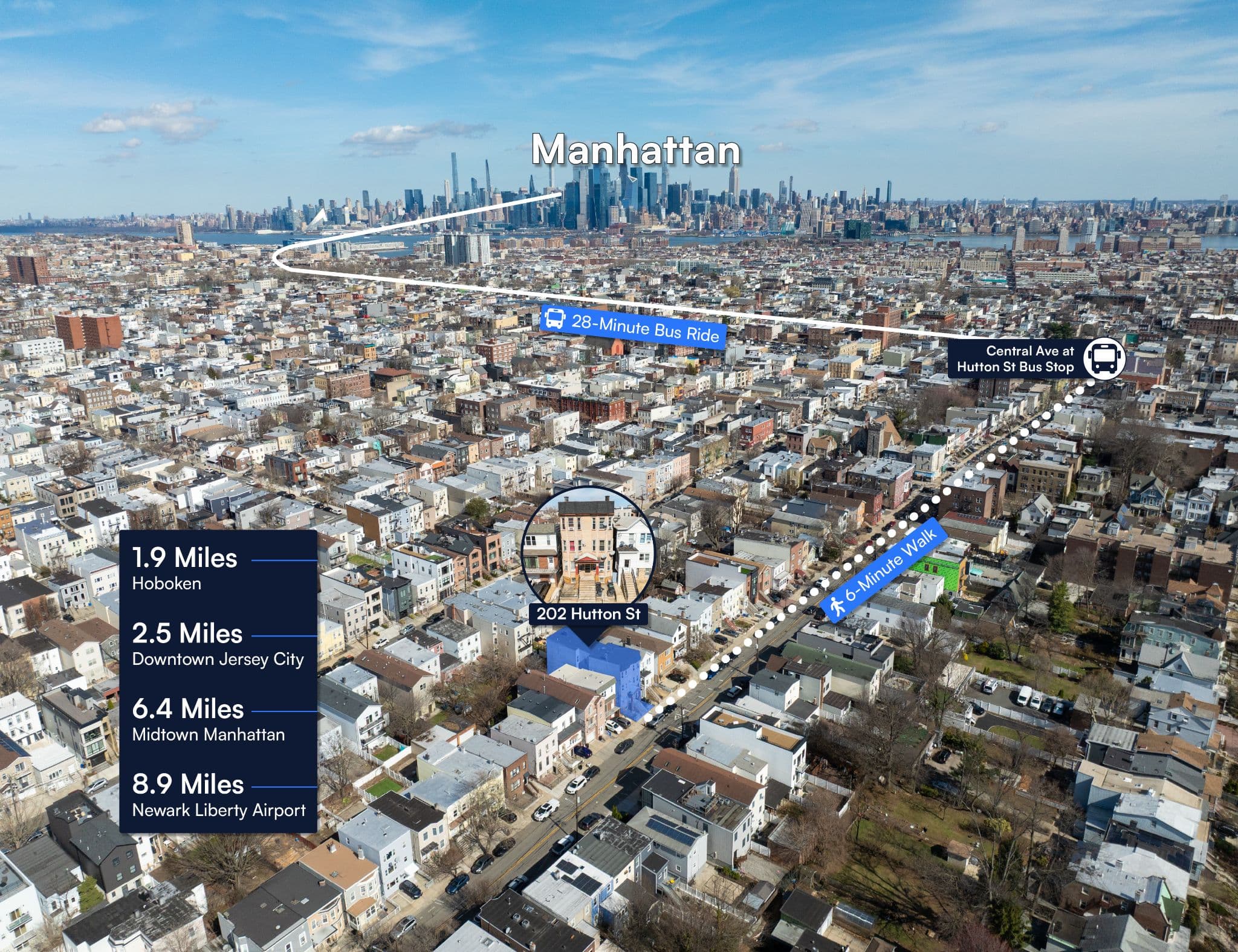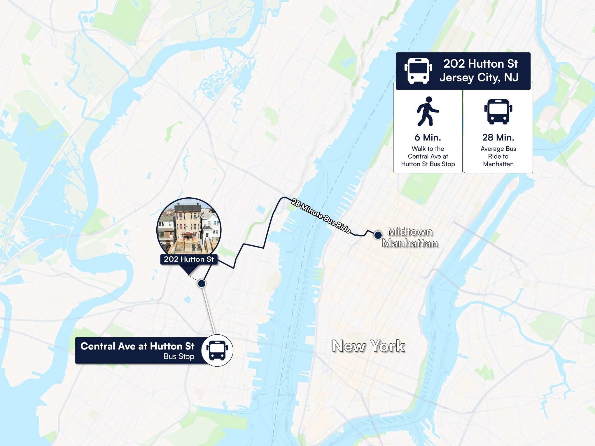 The building is approximately a 6-minute walk to the Central Ave at Hutton St bus stop which provides a 28-minute bus ride directly to Midtown Manhattan.