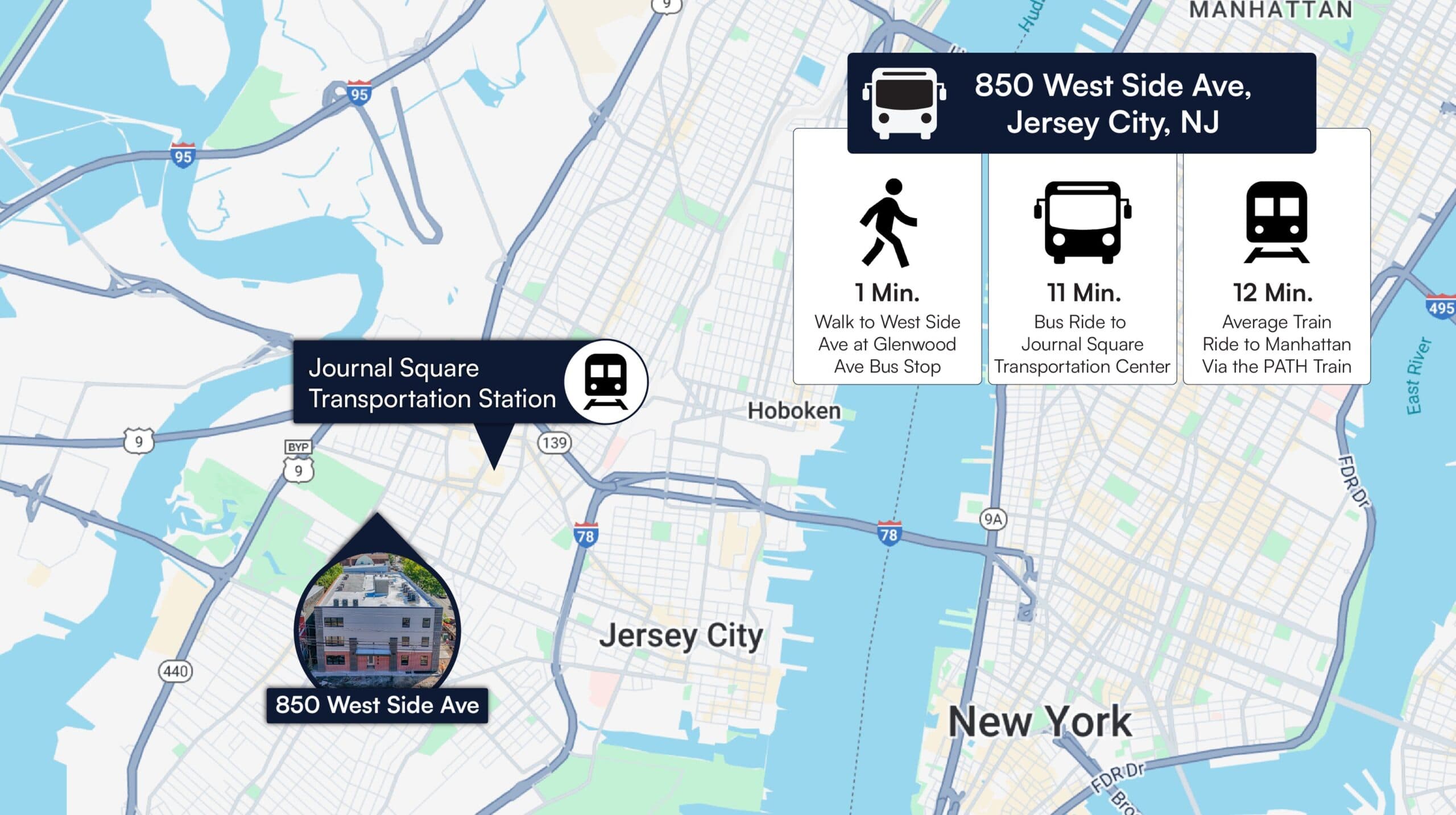 - The building is approximately a 1-minute walk to West Side Ave at Glenwood Ave bus stop which provides a 20 minute trip to Manhattan via the PATH Train.