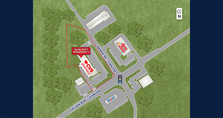 - Prominent hard-corner location at a four-way, signalized intersection with excellent visibility and access—benefiting from ±23,000 vehicles per day (VPD) along Mt. Zion Blvd.