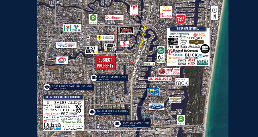 - Positioned along North Federal Highway, one of Fort Lauderdale’s busiest thoroughfares, the property benefits from exceptional visibility with over 54,500 vehicles per day.