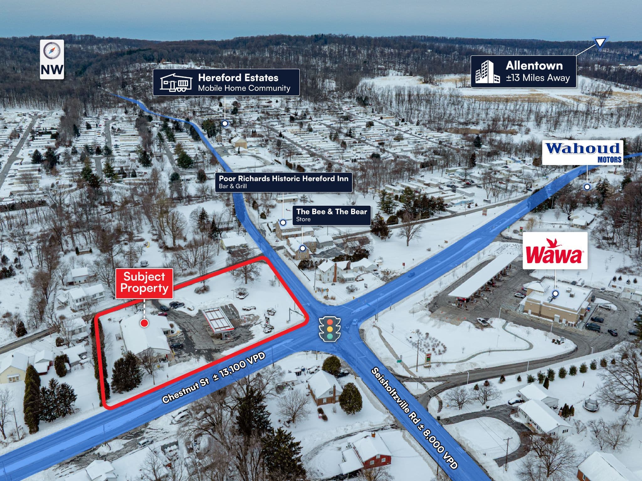 Strong Vehicular Exposure: Strategically located at a signalized intersection along Route 100 and Seisholtzville Rd, with approximately 13,100 vehicles per day.