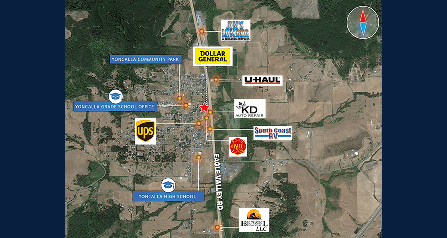 Situated in Douglas Couty on Eagle Valley Road just 2.6 miles north of Highway 5; approximately 40 minutes south of Eugene, OR and is located on the main highway through Yoncalla near the grade school and high school