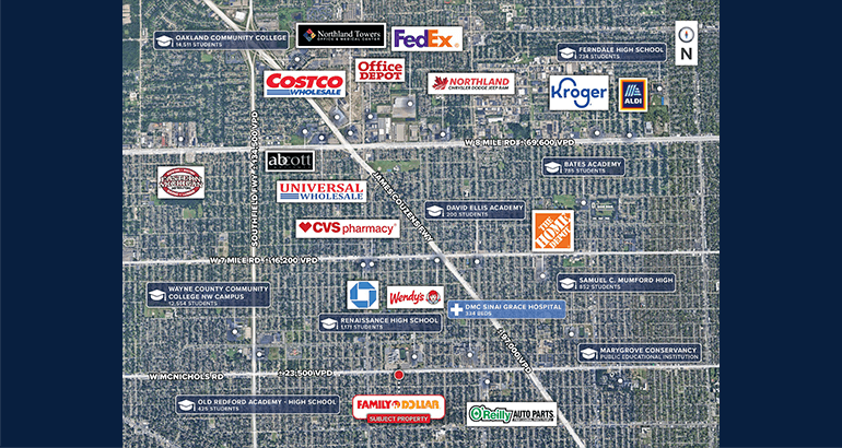 • ±10 miles from Downtown Detroit and traffic counts are in excess of ±23,500 VPD