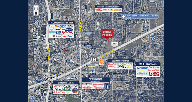 Prime Location: Ideally situated with convenient access to major thoroughfares, including the Dallas North Tollway and Sam Rayburn Tollway (SH 121) which sees ±139,600 VPD, offering seamless connectivity to Frisco, Plano, The Colony, and the broader Dallas-Fort Worth metroplex.