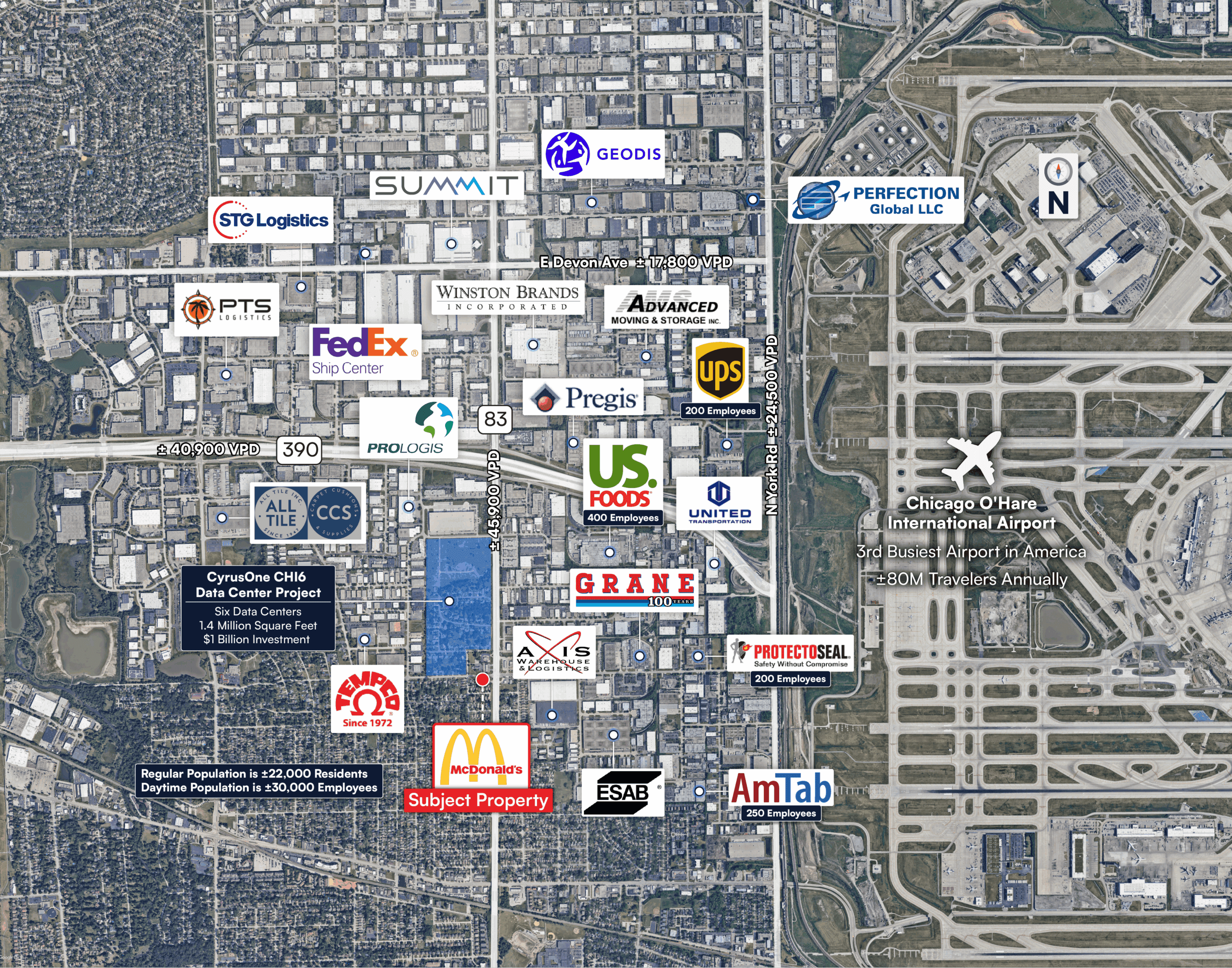 - The subject property is positioned within a core industrial corridor near prominent national and global employers, including UPS, U.S. Foods, Prologis, and United Airlines. This employment density drives consistent daytime traffic and supports local retail performance. The daytime population within 2 miles of the Subject Property exceeds 30,000 people.