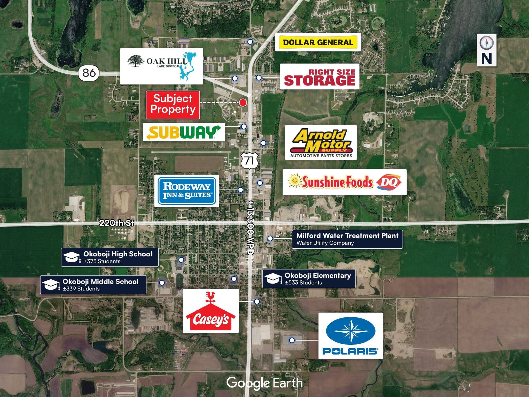 Strategic Highway Location Serving Okoboji Lakes Corridor: The property is ideally positioned along U.S. Highway 71, the primary north-south corridor connecting regional traffic directly into the Iowa Great Lakes and Okoboji area—one of the Midwest’s most popular seasonal destinations. This location captures a combination of consistent local traffic and significant seasonal tourism flow, providing strong visibility and accessibility for both residents and travelers. The surrounding trade area is supported by solid consumer fundamentals, with average household incomes of approximately $111,108 within a 5-mile radius, reinforcing year-round dining demand.