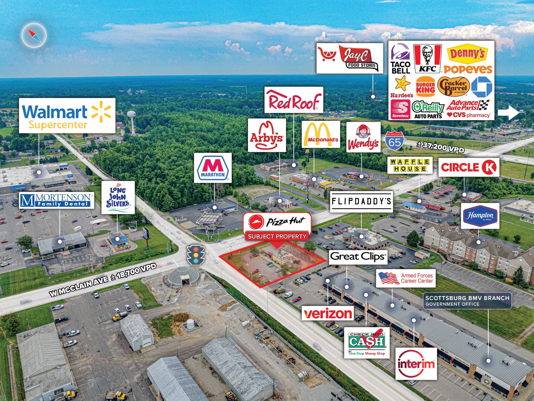 Interstate-Adjacent Location – Exceptional access to I-65, a key north-south route connecting Scottsburg to major economic centers such as Louisville and Indianapolis experiencing traffic volumes of approximately ±37,200 vehicles per day supporting consistent consumer traffic.