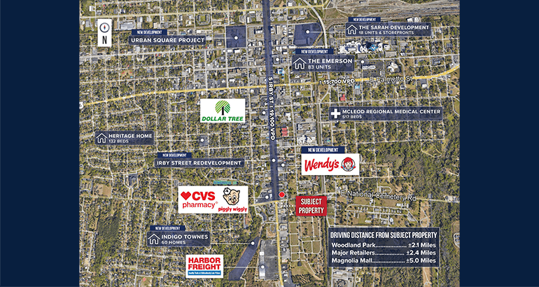 HARD CORNER SIGNALIZED INTERSECTION – Located at the high-traffic, signalized intersection of S Irby St and Cherokee Rd, this property enjoys excellent visibility and accessibility. With combined traffic counts exceeding + 30,000 VPD, the site offers strong daily exposure in a centrally located retail corridor.