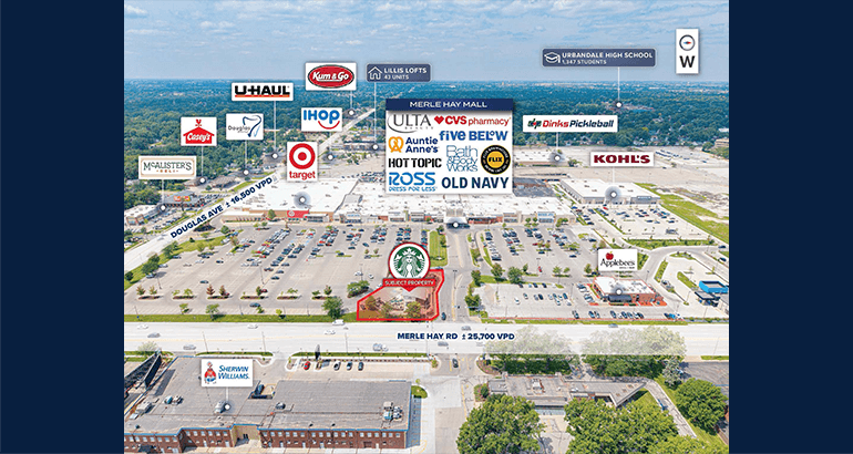 Excellent Demographics and Trade Area – There are over 195,000 people in a 5-mile radius and average household income exceeds $100,000. Merle Hay Mall is centrally located in an affluent area of Des Moines, and is home to Target, Ross, Old Navy, Bath & Body Works and ULTA to name a few. The Starbucks is ideally positioned at the entrance to the mall.