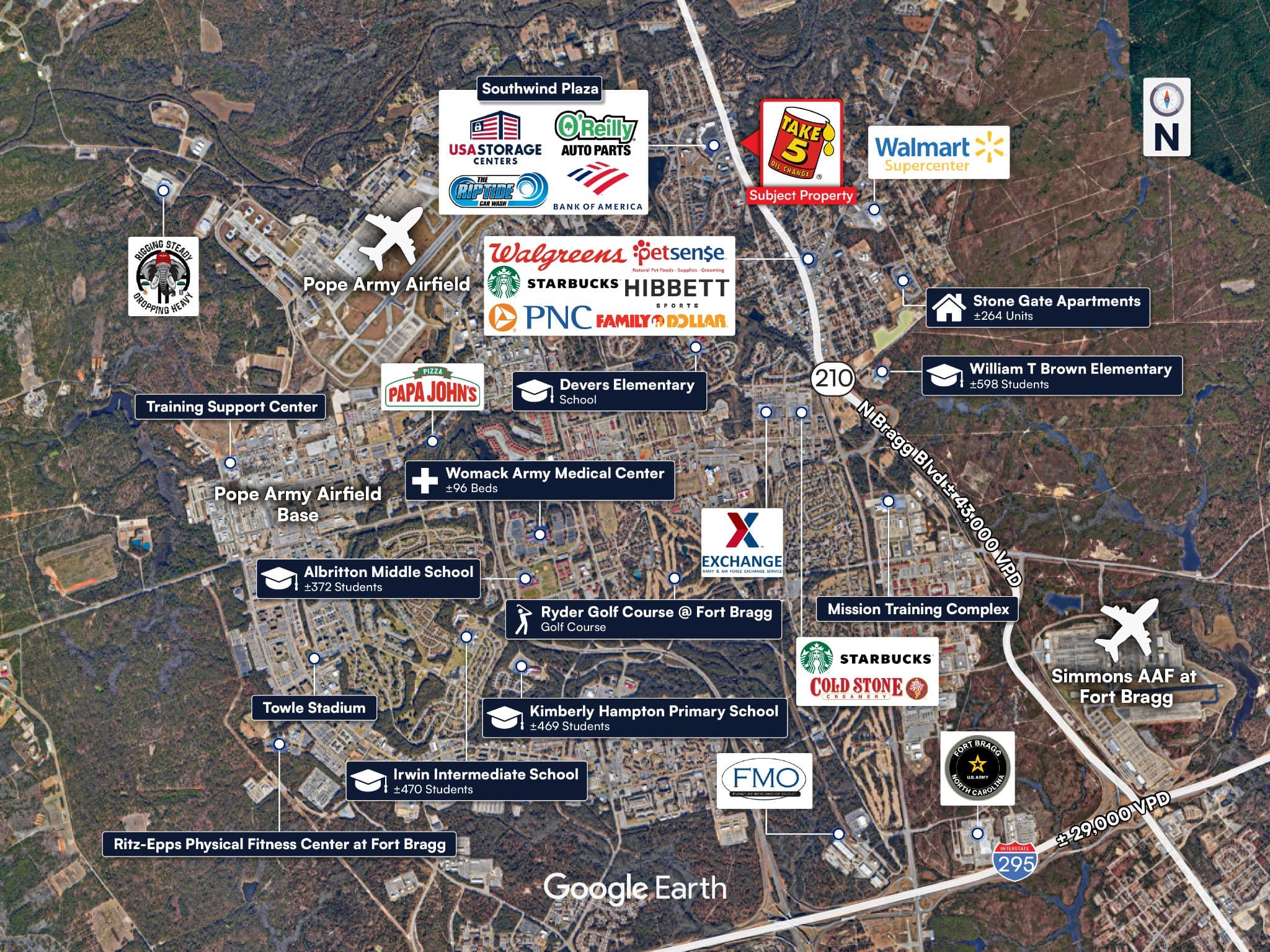 Located at the hard signalized corner of N Bragg Blvd & New St, which see a approximately 43,000 vehicles daily